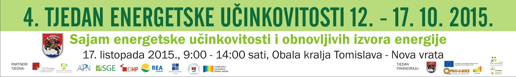 U cilju razvijanja svijesti građana o nužnosti učinkovitog korištenja energije kao i promocije korištenja obnovljivih izvora energije Grad Zadar organizira četvrti po redu tjedan energetske učinkovitosti. U sklopu Tjedna održat će se niz događanja na kojem će sva zainteresirana javnost moći dobiti korisne informacije o uštedi energije, mogućnostima sufinanciranja energetske obnove višestambenih zgrada i obiteljskih kuća kao i korištenju obnovljivih izvora energije. Sva predavanja održavat će se u multimedijalnoj dvorani Gradske knjižnice Zadar na koja su dobrodošli svi zainteresirani. Tjedan završava održavanjem Sajma energetske učinkovitosti i obnovljivih izvora energije na Obali kralja Tomislava i Info dana promicanja električnih bicikala i skutera za dostavu robe i prijevoz putnika.