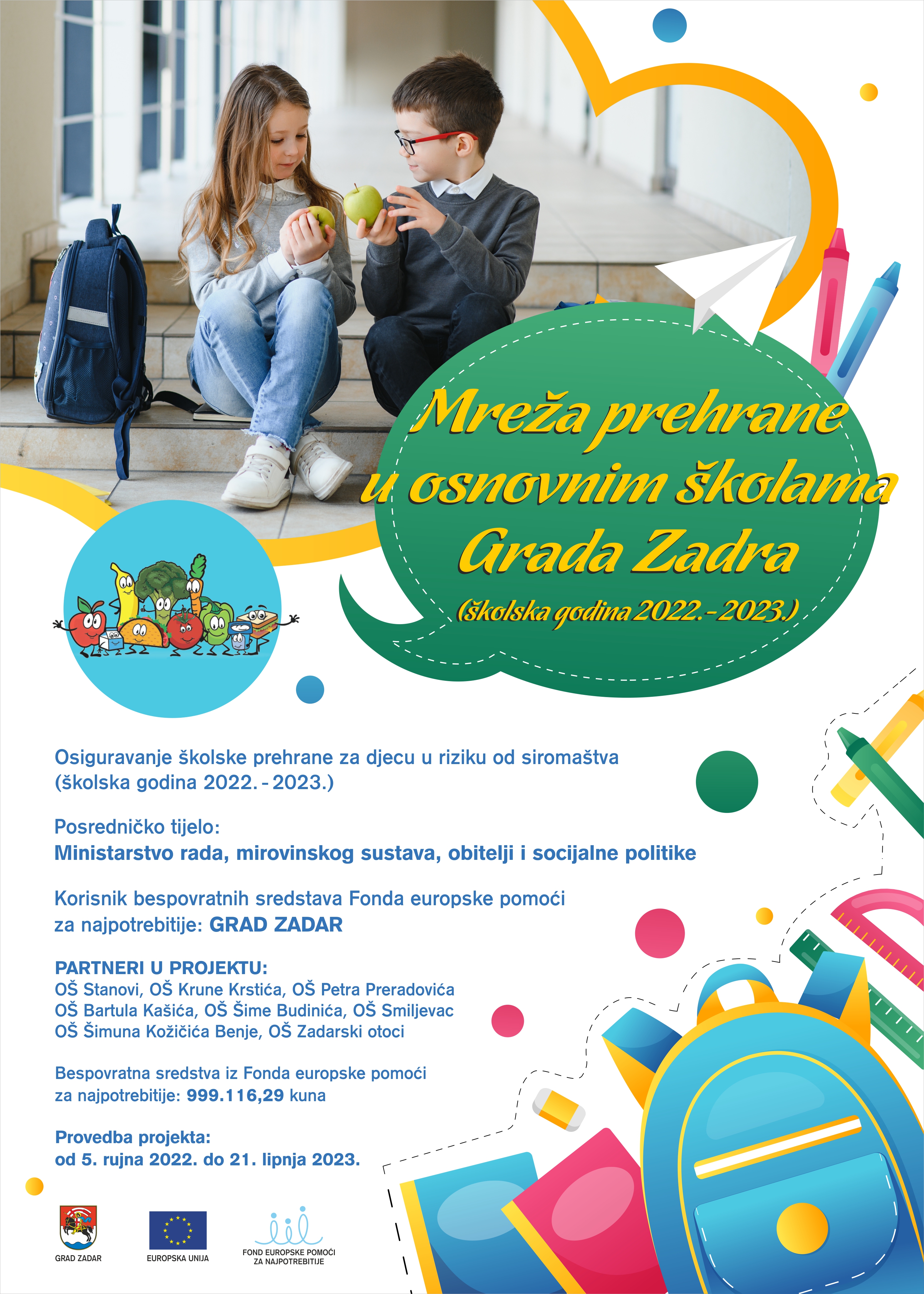 Ministarstvo rada, mirovinskog sustava, obitelji i socijalne politike je odobrilo projektni prijedlog Grada Zadra te se donijela Odluka o financiranju. Vrijednost projekta za školsku godinu 2022./2023. je 999.116,29 kuna. Projekt će se provoditi od 5. rujna 2022. do 21. lipnja 2023. godine.