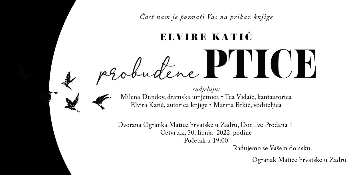 Promocija knjige PROBUĐENE PTICE održat će se u četvrtak, 30. lipnja 2022. godine, s početkom u 19 sati u dvorani Ogranka Matice hrvatske u Zadru.