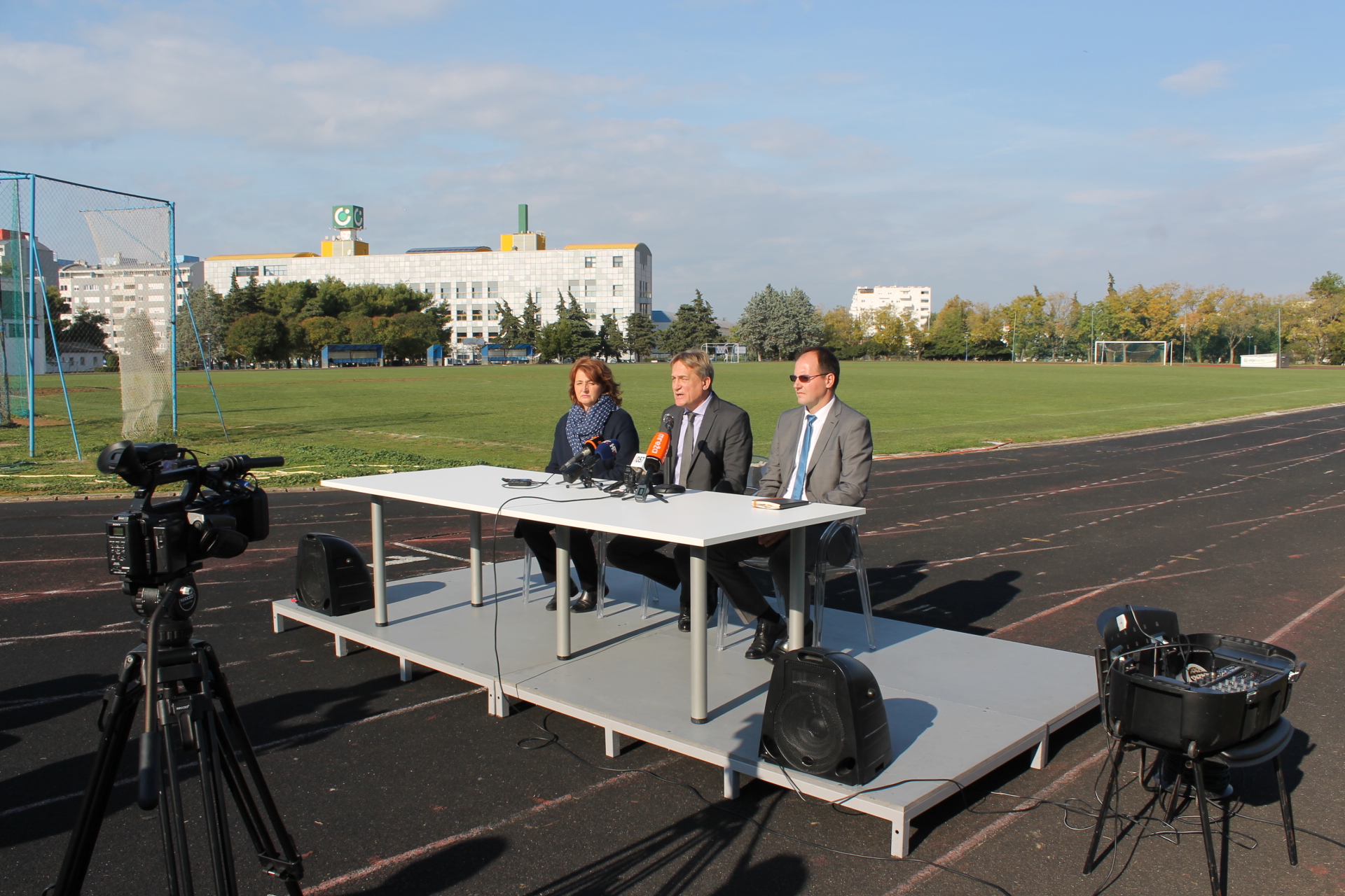 Gradonačelnik Zadra, Božidar Kalmeta s direktorom ŠC Višnjik, Denisom Karlovićem i predsjednicom Sportske zajednice Grada Zadra, Snježanom Jurinić, održao je danas na atletskoj stazi na Višnjiku konferenciju za medije na temu daljnjeg ulaganja u sportsku infrastrukturu na Višnjiku.