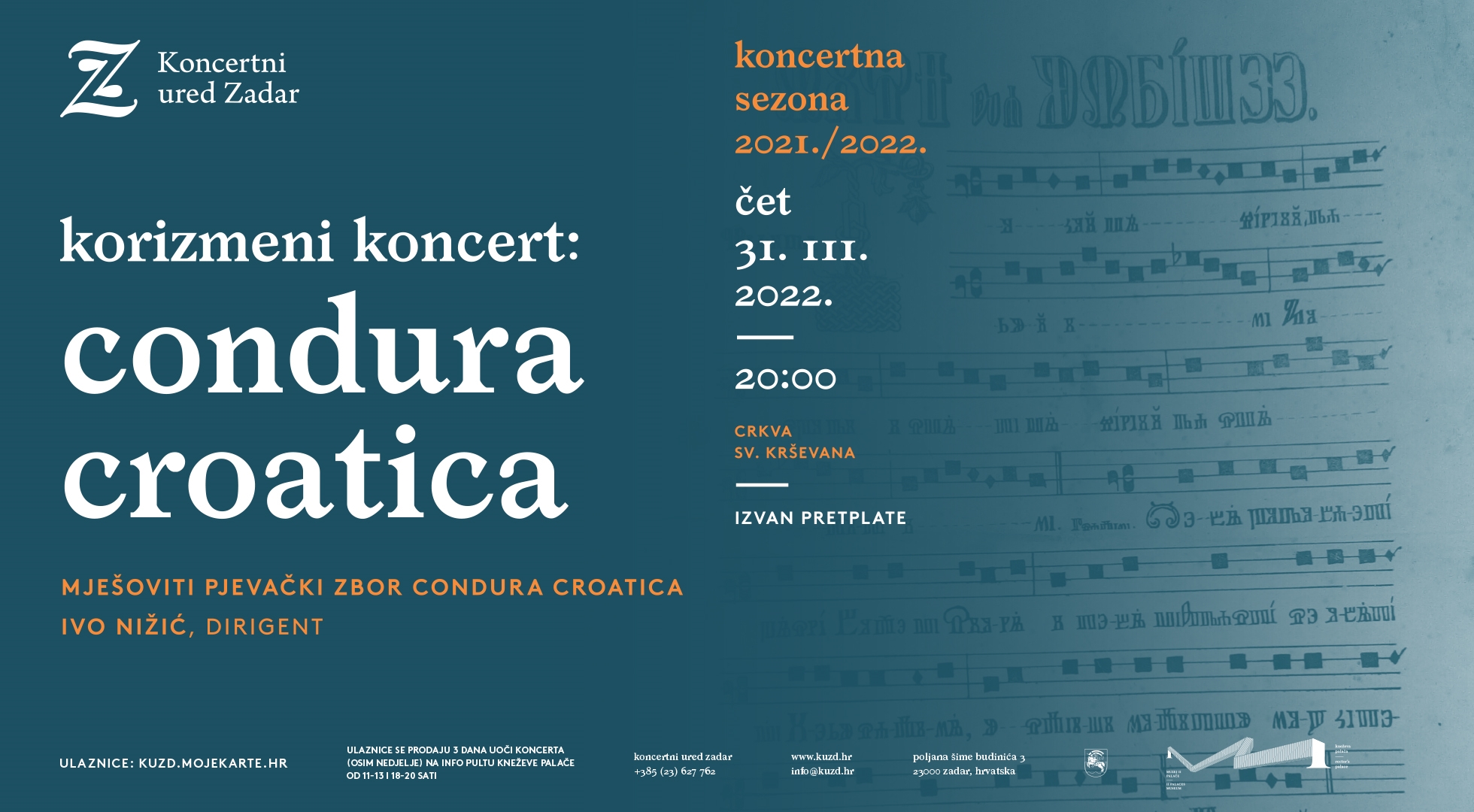 U četvrtak, 31. 3. u crkvi sv. Krševana s početkom u 20 sati nastupa Mješoviti pjevački zbor Condura Croatica, koji će izvesti korizmeni program pjesama nadahnutih glagoljaškom baštinom. Ulaznice se prodaju na adresi kuzd.hr i na info pultu Kneževe palače od 11-13 i 18-20 sati, s time da na dan koncerta blagajna u 19 sati seli ispred crkve sv. Krševana.