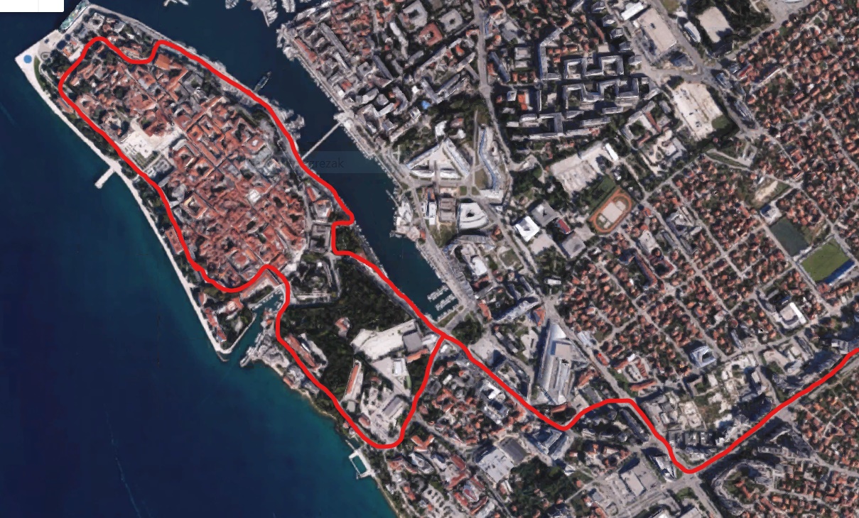 Zagrebačka ulica – Ante Starčevića – Dr. Franje Tuđmana - Put Murvice - Zrinsko- Frankopanska - O.K. Tomislava – Bartula Kašića – Šime Vitasovića – Narodnog lista – O.K. Tomislava - Liburnska obala – lančana vrata - Tri bunara – Božidara Petranovića – Zadarskog mira 1358 (ciljna ravnina) - te se nakon toga nastavlja utrka i vozi se još jedan krug dionicom – Mihovila Pavlinovića – Ruđera Boškovića – A. Kuzmanića – Kopnena vrata – K. D. Zvonimira – Marka Marulića – N.Š. Zrinskog – A. Starčevića (od raskrižja sa ul. K. Tvrtka do raskrižja sa F. Tuđmana se vozi suprotnim smjerom) - F. Tuđmana - Put Murvice - Zrinsko- Frankopanska - O.K. Tomislava – Bartula Kašića – Šime Vitasovića – Narodnog lista – O.K. Tomislava - Liburnska obala – lančana vrata - Tri bunara – Božidara Petranovića – Zadarskog mira 1358 (ciljna ravnina kod šetnice Šimuna Kožičića Benje).