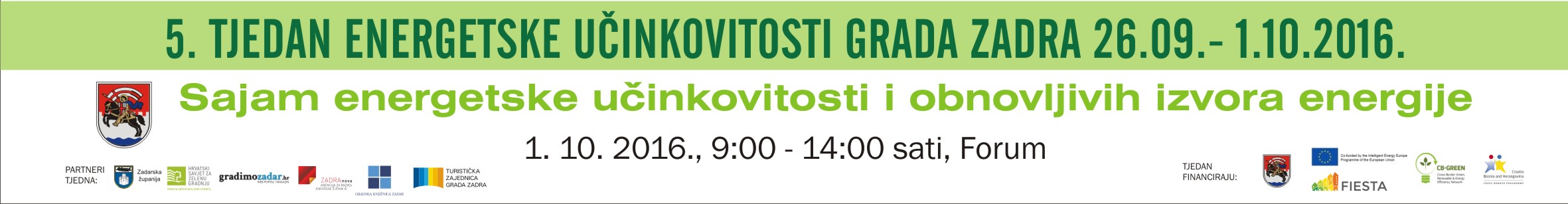 Grad Zadar i ove godine organizira peti po redu tjedan energetske učinkovitosti Grada Zadra od 26. rujna do 1. listopada 2016. godine. Tom prigodom održat će se niz događanja s ciljem razvijanja svijesti o nužnosti učinkovitog korištenja energije kao i promocije energetski učinkovitih uređaja i korištenja obnovljivih izvora energije. Tematska predavanja i radionice biti će dostupni svoj zainteresiranoj javnosti, a predviđene su i radionice za djecu predškolske dobi u Dječjem vrtiću Radost područnim objektima Višnjik, Voštarnica i Vruljica te Dječjem vrtiću Sunce područnim objektima Ciciban i Jazine. Sva predavanja održat će se u multimedijalnoj dvorani Gradske knjižnice Zadar na koja su dobrodošli svi zainteresirani građani. Tjedan završava u subotu, 1. listopada 2016. godine održavanjem Sajma energetske učinkovitosti i obnovljivih izvora energije na Forumu na kojem će se predstaviti vodeći proizvođači i tvrtke iz područja energetske učinkovitosti i obnovljivih izvora energije putem demonstracijskih vozila i/ili štandova s informativnim brošurama. Na Sajmu će građani u okviru kampanje EU projekta CB-GREEN moći dobiti informacije o učinkovitom korištenju energije u vlastitom domu, također obitelji s djecom s područja Grada Zadra će u okviru EU projekta FIESTA moći zatražiti besplatno energetsko savjetovanje i energetsku analizu doma, dok će Zadarska županija, umirovljenicima i građanima slabijeg imovinskog stanja koji primaju zajamčenu minimalnu naknadu s područja Grada Zadra i Zadarske županije u okviru promicanja energetske učinkovitosti donirati štedne LED žarulje.