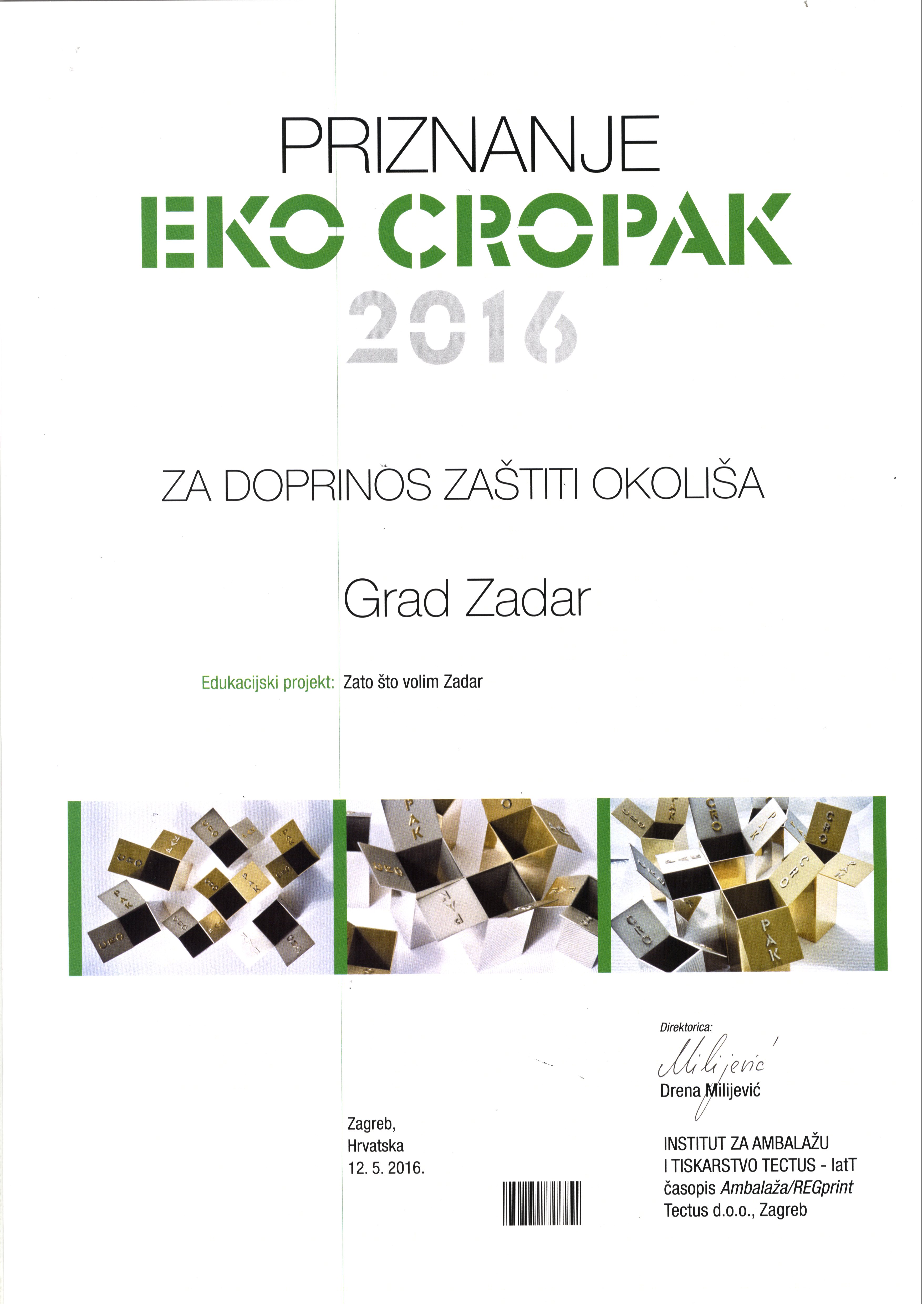 Grad Zadar dobitnik priznanja EKO CROPAK 2016. za doprinos zaštiti okoliša