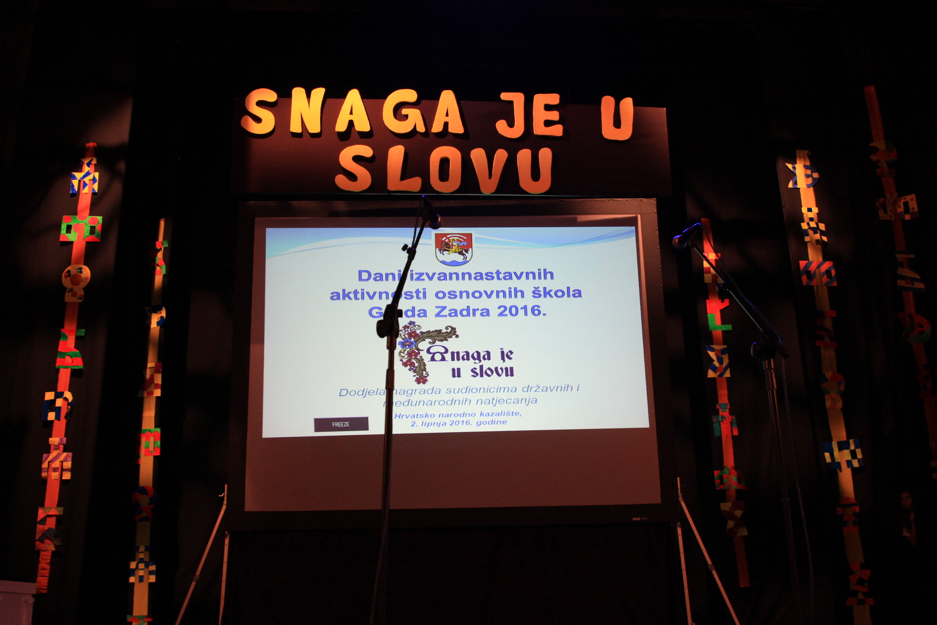 Pod motom „Snaga je u slovu“, a u sklopu Dana izvannastavnih aktivnosti koje organizira Upravni odjel za odgoj i školstvo Grada Zadra, 2. lipnja 2016. godine u Hrvatskom narodnom kazalištu održana je svečanost na kojoj su uručene pohvalnice, zahvalnice i prigodni pokloni učenicima i njihovim mentorima koji su na državnim natjecanjima osvojili prvo, drugo ili treće mjesto.