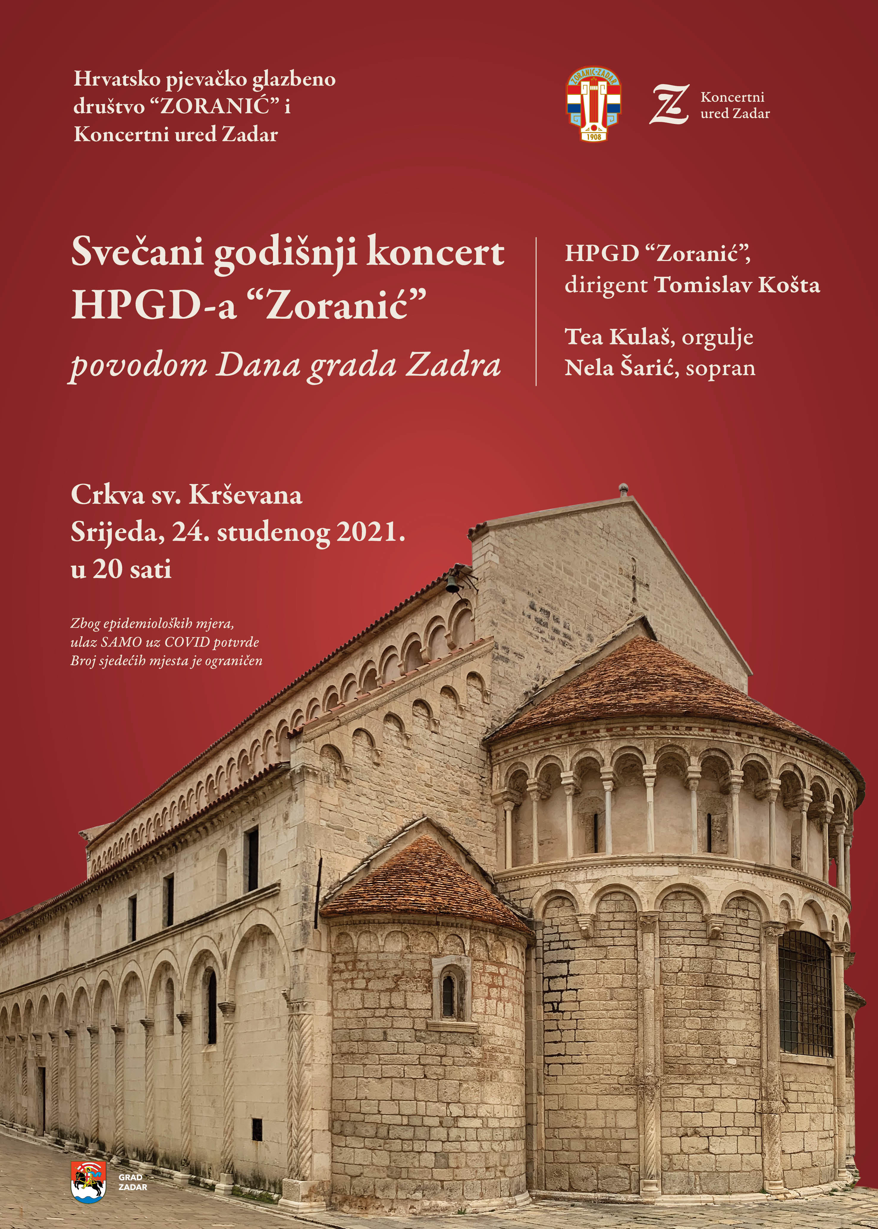 Proslavu Dana grada Zadra i blagdan sv. Krševana svečanim će koncertom uveličati i mješoviti pjevački zbor Hrvatskog pjevačko glazbenog društva „Zoranić“.