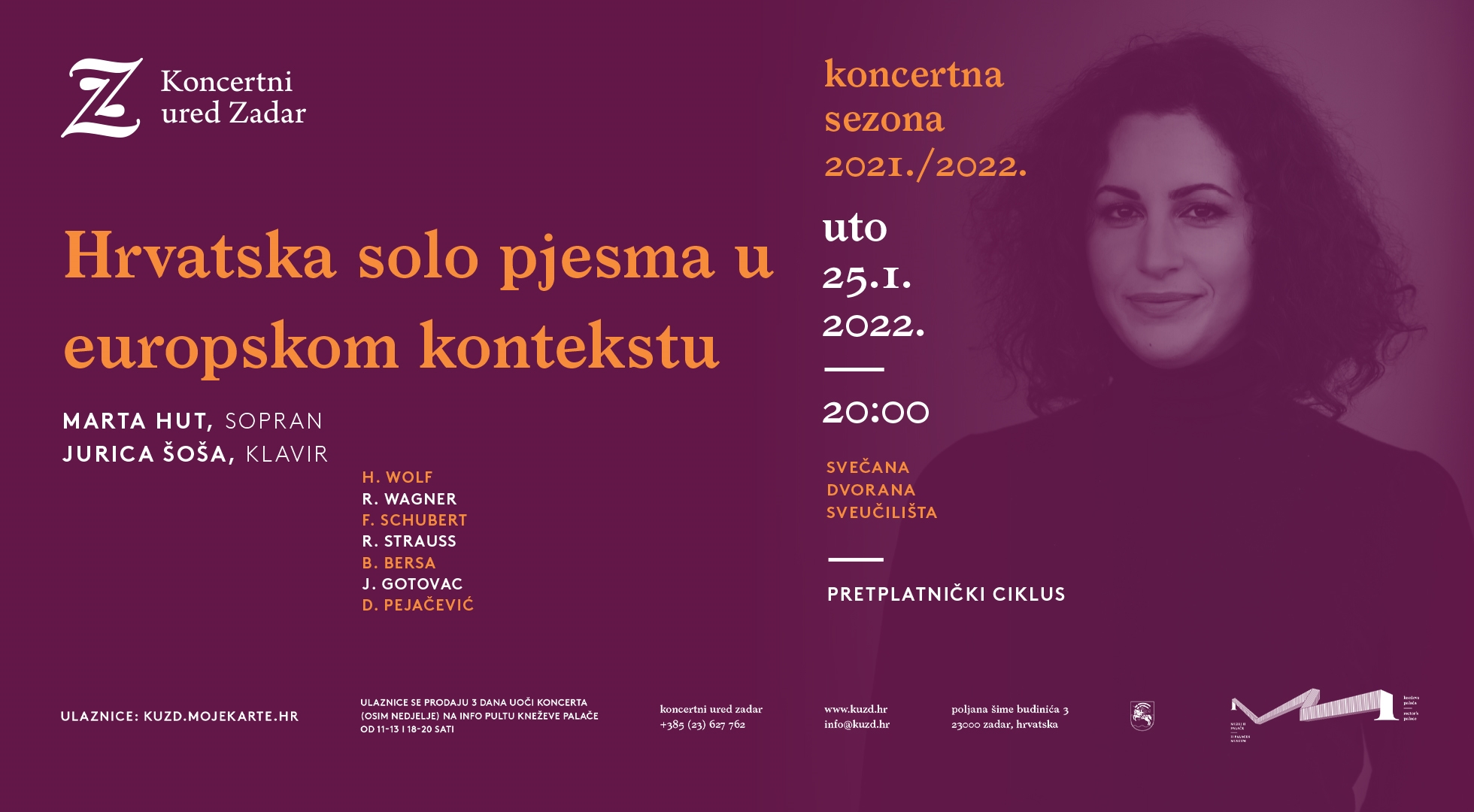 Programom pod nazivom Hrvatska solo pjesma u europskom kontekstu, nastavlja se ciklus pretplate Koncertnog ureda Zadar. Koncert, koji je bio odgođen zbog bolesti izvođača, na rasporedu je u ponedjeljak, 7. veljače 2022. u 20 sati u Svečanoj dvorani Sveučilišta, a nastupit će Marta Hut i Jurica Šoša. To je ujedno nastavak projekta Bersijada, koji promovira glazbu najznačajnijeg skladatelja hrvatske moderne koji je dio života proveo u Zadru.