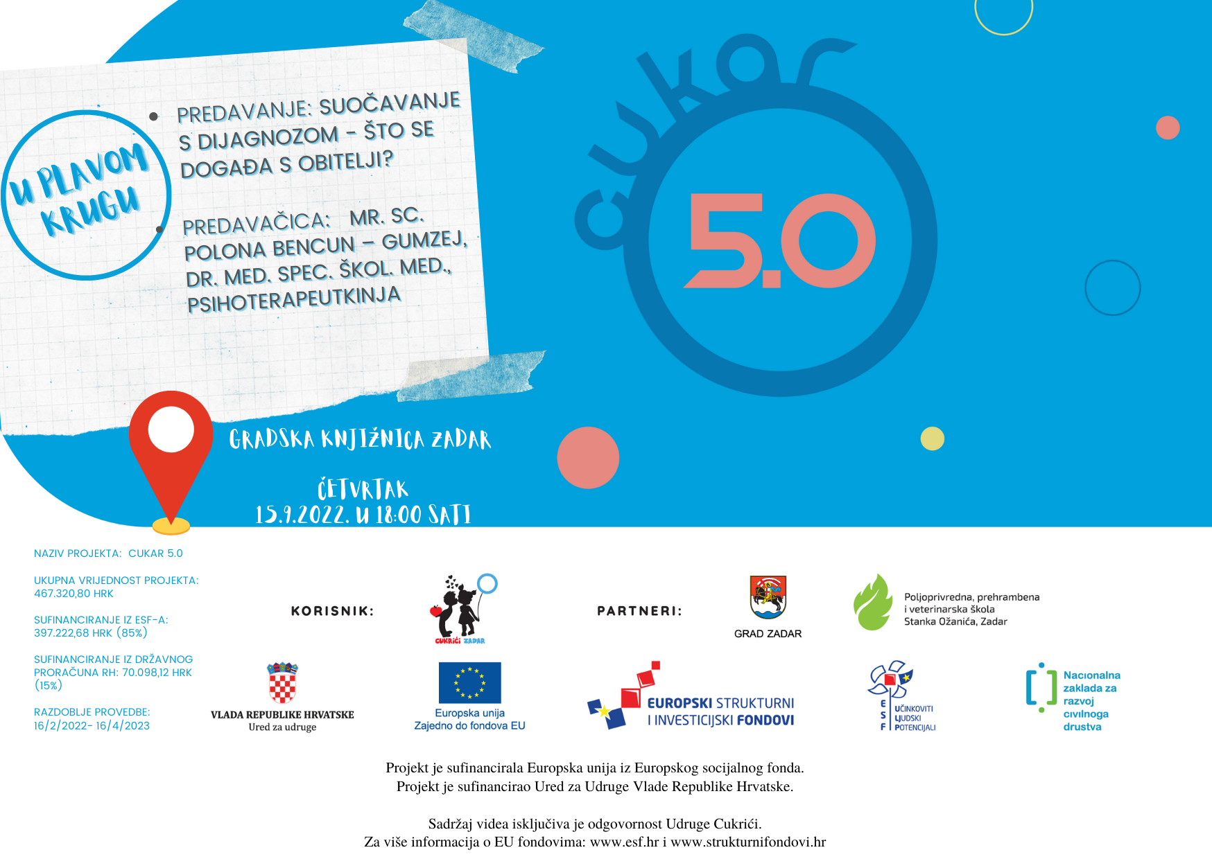 Predavanje je organizirano je u sklopu Projekta CUKAR 5.0, ukupne vrijednosti 467.320,80 HRK koji je sufinancirala EU iz ESF-a u ukupnom iznosu od 397.222,68 HRK u okviru Poziva „Jačanje kapaciteta OCD-a za odgovaranje na potrebe lokalne zajednice“. Nositelj projekta je Udruga djece oboljele od dijabetesa i njihovih roditelja Cukrići - Zadar a partneri su Grad Zadar i Poljoprivredna, prehrambena i veterinarska škola Stanka Ožanića, Zadar. Praćenje predavanja bit će omogućeno i putem FB stranice „Cukrići – Zadar“.