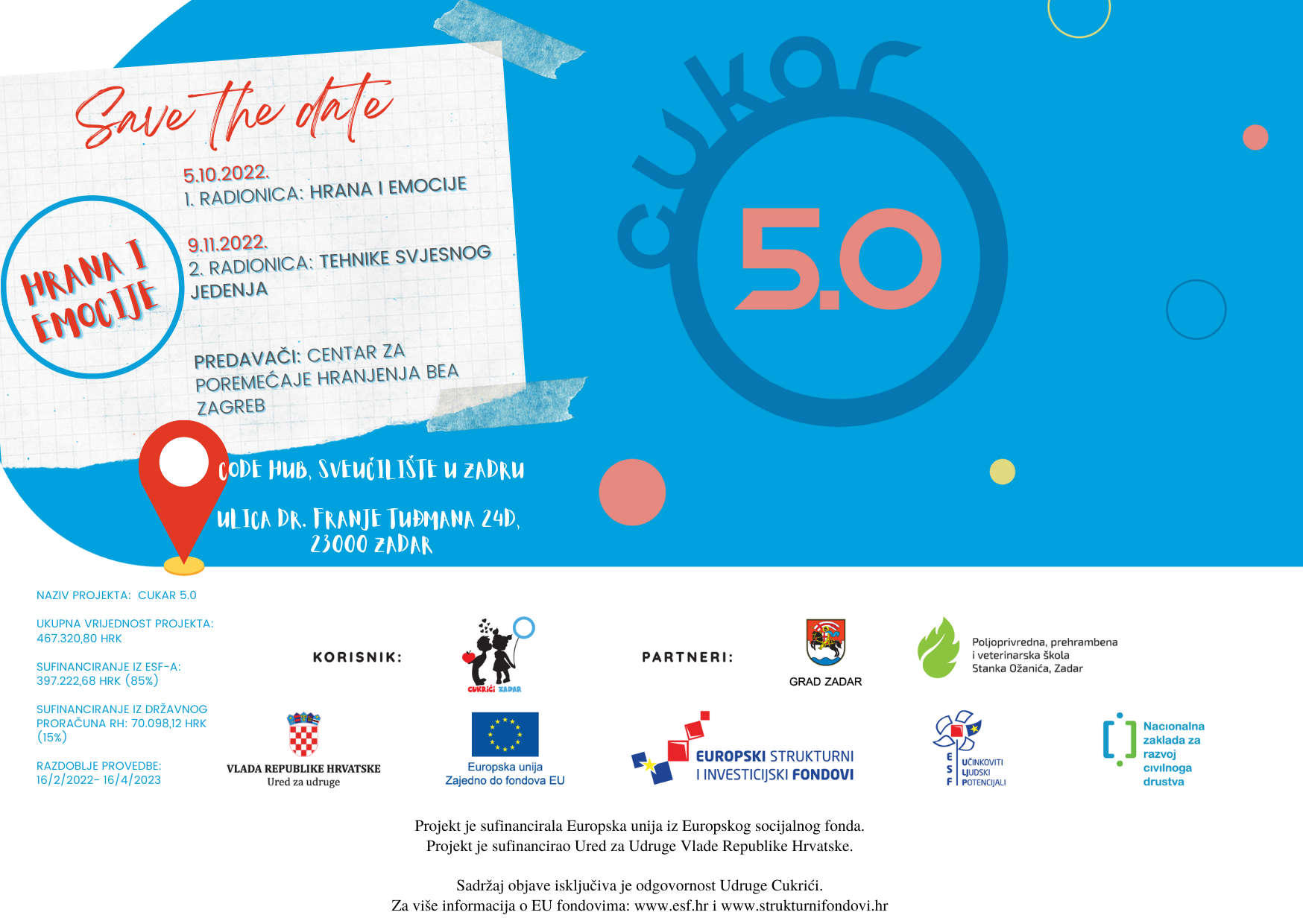 Radionice su orgamnizirane u sklopu Projekta CUKAR 5.0, ukupne vrijednosti 467.320,80 HRK koji je sufinancirala EU iz ESF-a u ukupnom iznosu od 397.222,68 HRK u okviru Poziva „Jačanje kapaciteta OCD-a za odgovaranje na potrebe lokalne zajednice“. Nositelj projekta je Udruga djece oboljele od dijabetesa i njihovih roditelja Cukrići - Zadar a partneri su Grad Zadar i Poljoprivredna, prehrambena i veterinarska škola Stanka Ožanića, Zadar. Više o Projektu CUKAR 5.0 možete pronaći na web stranici Udruge Cukrići.
