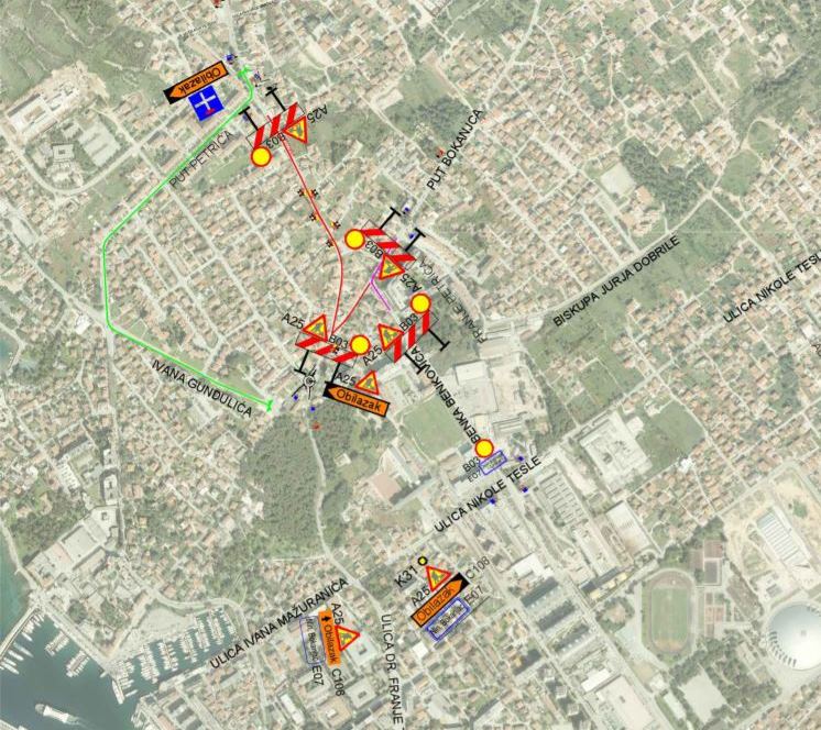 - Vozila iz smjera ulice Dr. Franje Tuđmana (Vruljica) i vozila iz smjera ulice Ivana Meštrovića (Marina) prolazit će obilazno kroz ulicu Ivana Gundulića.