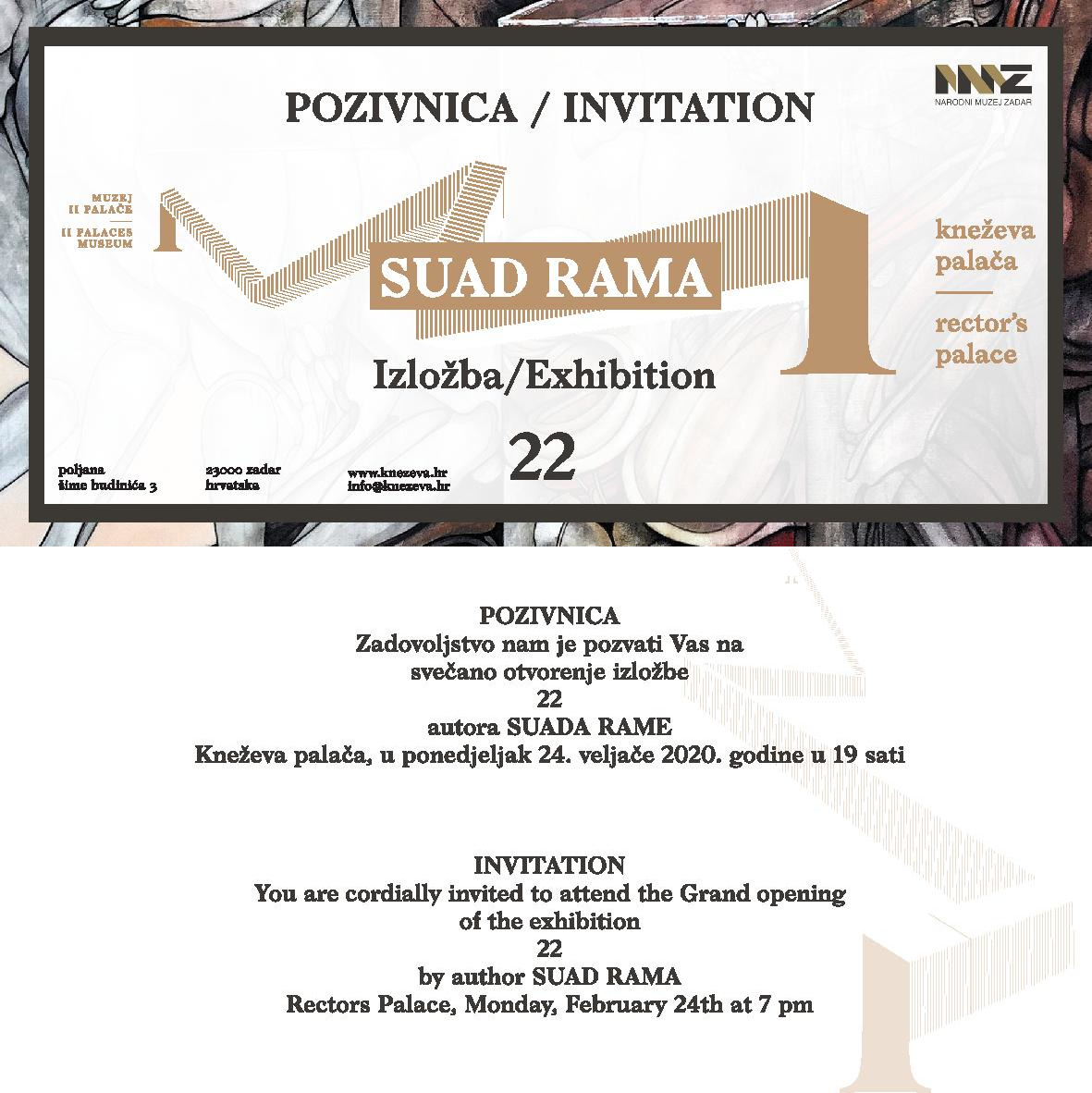 Svečano otvorenje izložbe „22“ autora Suada Rame, održat će se u ponedjeljak, 24. veljače 2020. godine, s početkom u 19 sati, u izložbenim dvoranama prizemlja Kneževe palače.