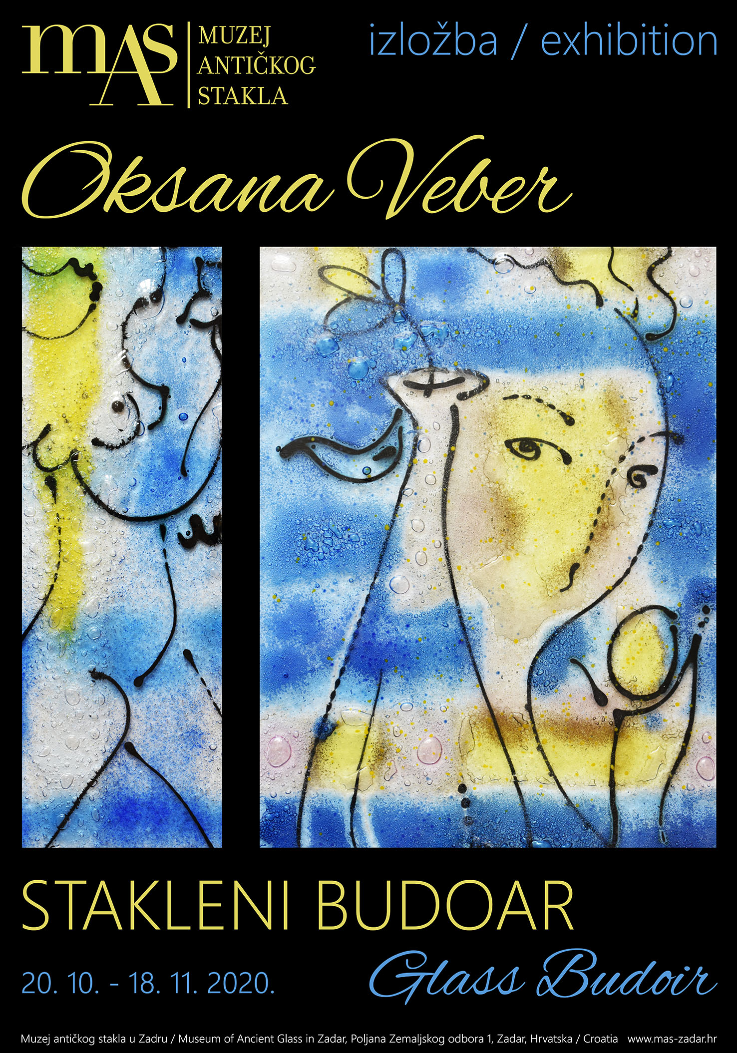 Otvorenje nove izložbe „Stakleni budoar“ ruske umjetnice Oksane Veber, održat će se u utorak, 20. listopada 2020. u maloj izložbenoj dvorani Muzeja, u sklopu obilježavanja Dana grada Zadra i blagdana sv. Krševana.