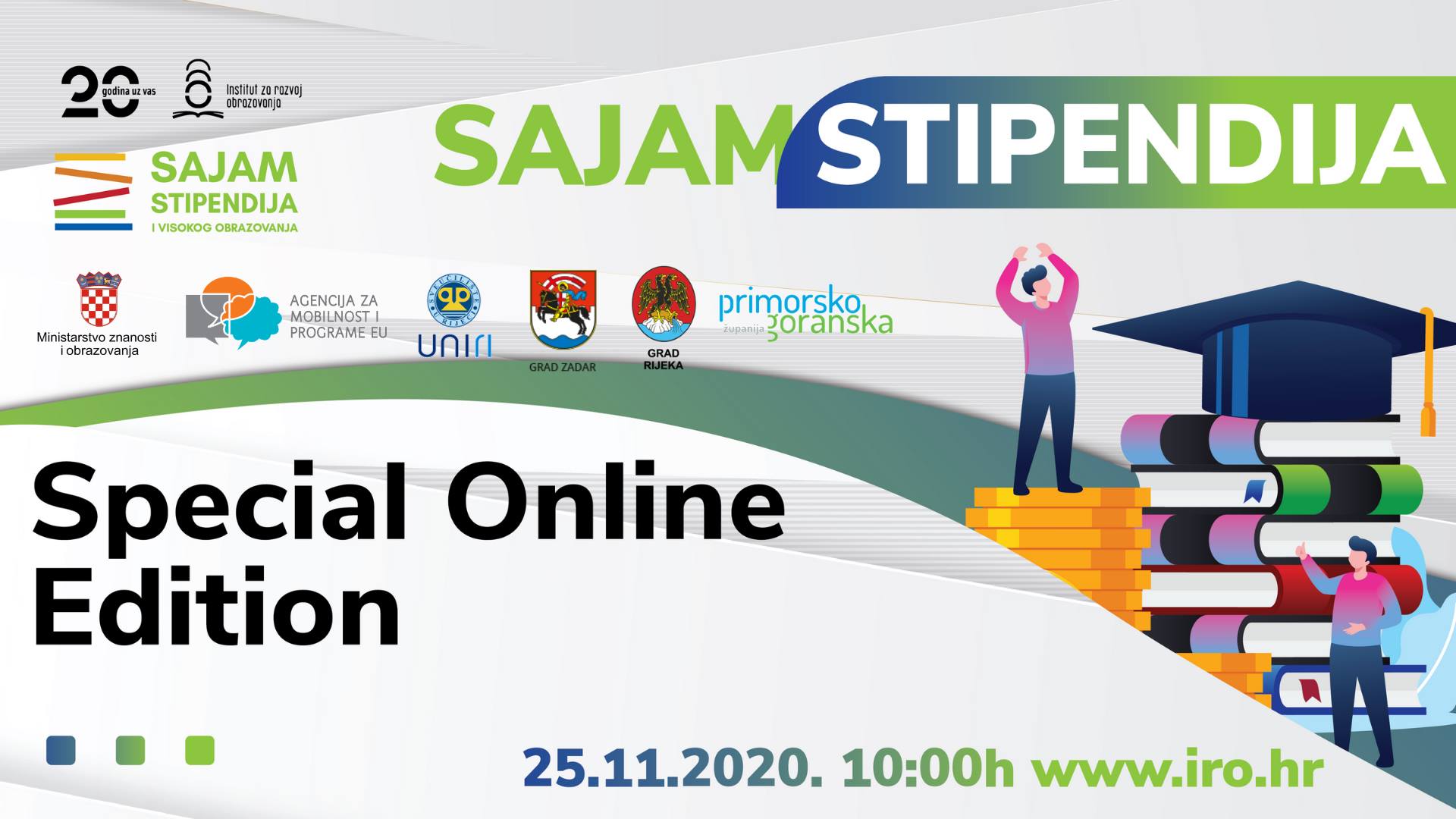Prvi online Sajam stipendija i visokog obrazovanja održat će se na internetskom portalu www.iro.hr 25. studenoga 2020. od 10 do 16 sati u jednostavnom i prilagodljivom formatu sudjelovanja, i za izlagače i za posjetitelje. Na istoj će se stranici moći pronaći satnica te službeni i popratni program.