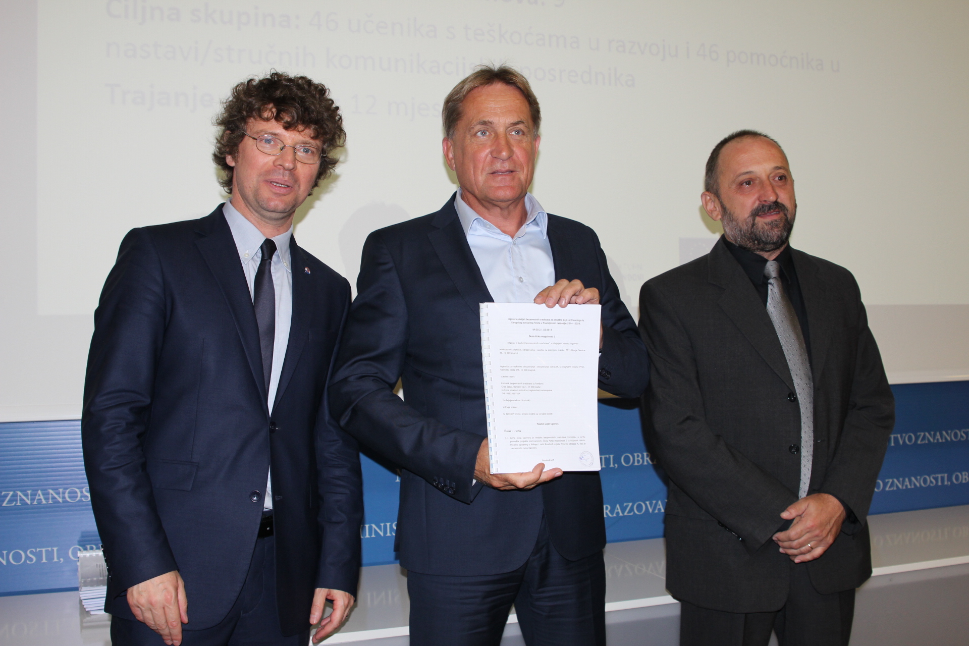 Svečani prijem prigodom dodjele bespovratnih sredstava održao se u Ministarstvu znanosti obrazovanja i športa. U ime Grada Zadra, jednog od 49 gradova i županija kojima su odobrena sredstva za zapošljavanje pomoćnika u nastavi, Ugovor o dodjeli bespovratnih sredstava potpisao je gradonačelnik Božidar Kalmeta. Ugovor su uručili Predrag Šustar, ministar znanosti, obrazovanja i sporta i Mile Živčić, ravnatelj Agencije za strukovno obrazovanje i obrazovanje odraslih, a svečanom prijemu nazočila je i Nada Šikić, ministrica rada i mirovinskoga sustava, čelnica Upravljačkog tijela za Operativni program „Učinkoviti ljudski potencijali 2014. - 2020.“, Europskog socijalnog fonda.