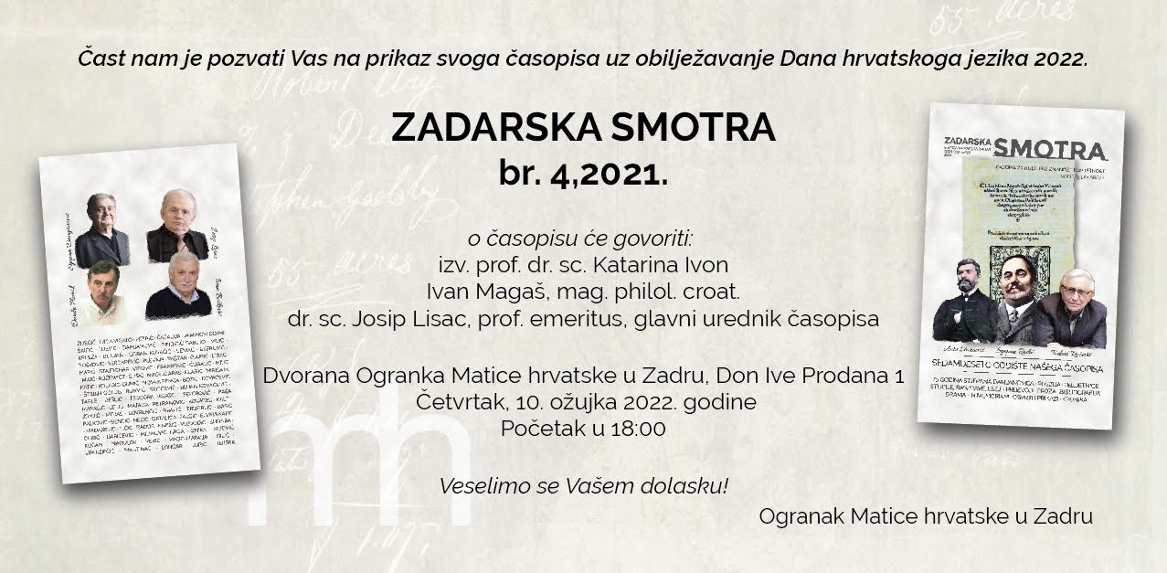 Uz Dane hrvatskoga jezika 2022., u godini obilježavanja 180. obljetnice Matice hrvatske, Ogranak Matice hrvatske u Zadru prikazuje časopis Zadarska smotra, br. 4., 2021. O 4. broju sedamdesetog godišta našeg časopisa govorit će: izv. prof. dr. sc. Katarina Ivon, Ivan Magaš, mag. philol. croat. i dr. sc. Josip Lisac, prof. emeritus, glavni urednik.