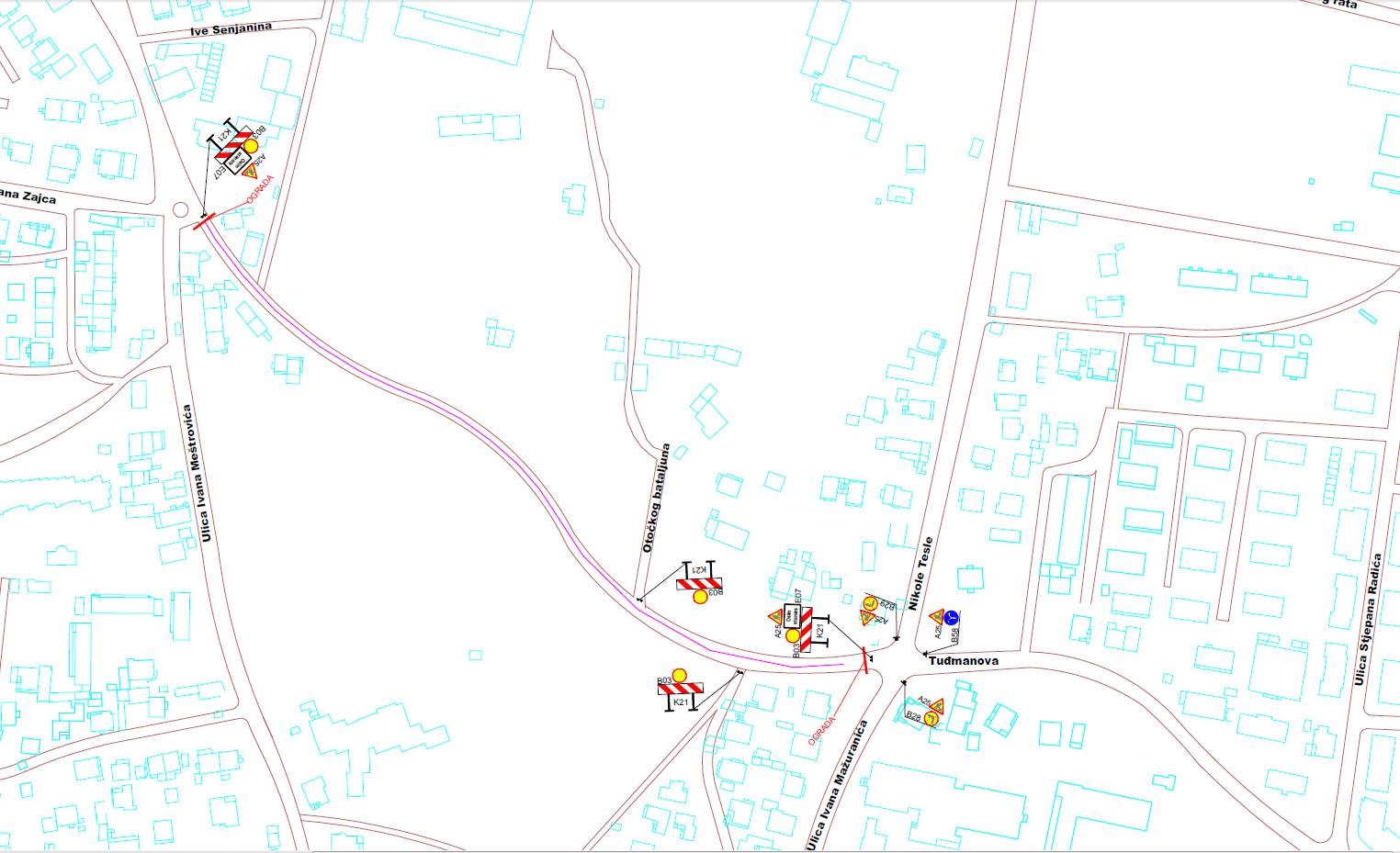 Ulica dr. Franje Tuđmana se sukladno slikama zatvara za promet zbog radova na sanaciji kolničke konstrukcije. Što se tiče javnog prijevoza tom trasom prolazi jedino linija br.7, a stupanjem na snagu privremene regulacije prometa poništiti će se stajalište kod Trgovačkog suda, s tim da će autobusi s Male pošte ići Radićevom prema Benka Benkovića pa na Put Bokanjca.