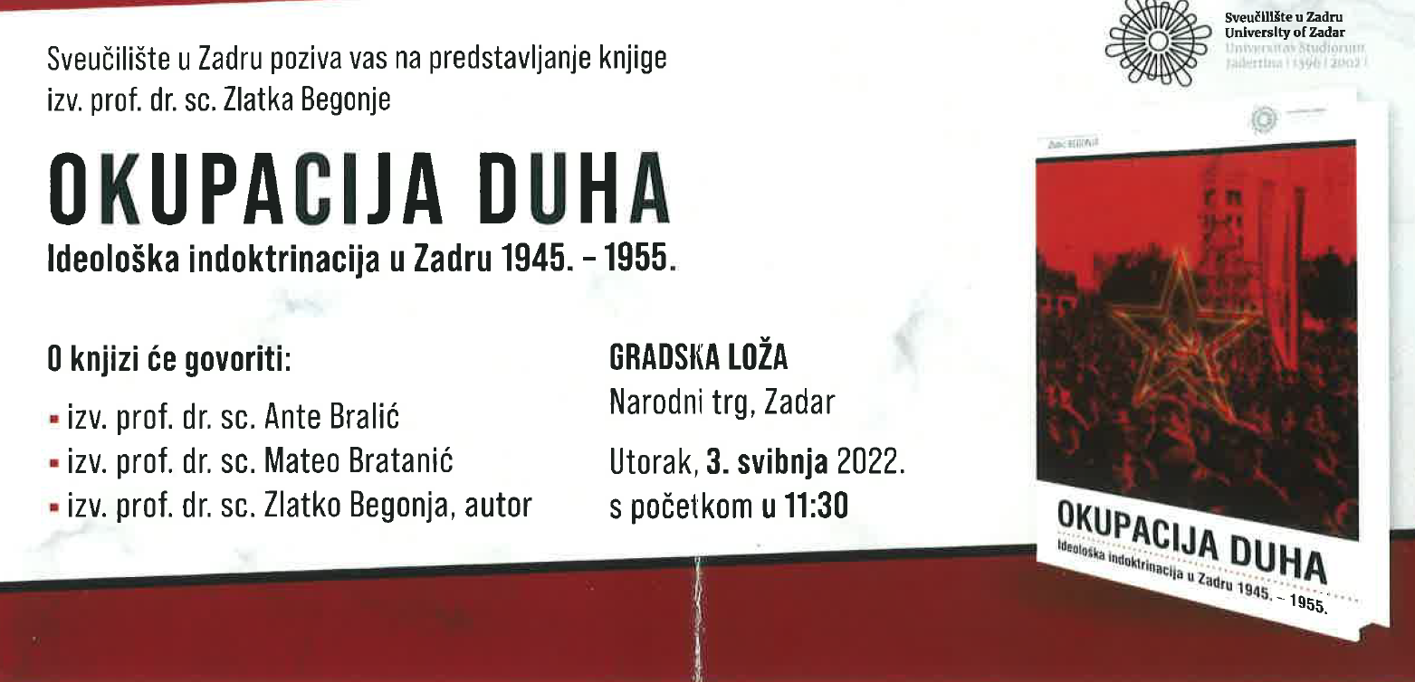 Promocija knjige pod nazivom "Okupacija duha: Ideološka indoktrinacija u Zadru 1945. – 1955." autora izv. prof. dr. sc. Zlatka Begonje održat će se u Gradskoj loži u utorak, 3. svibnja 2022. godine s početkom u 11.30 sati.