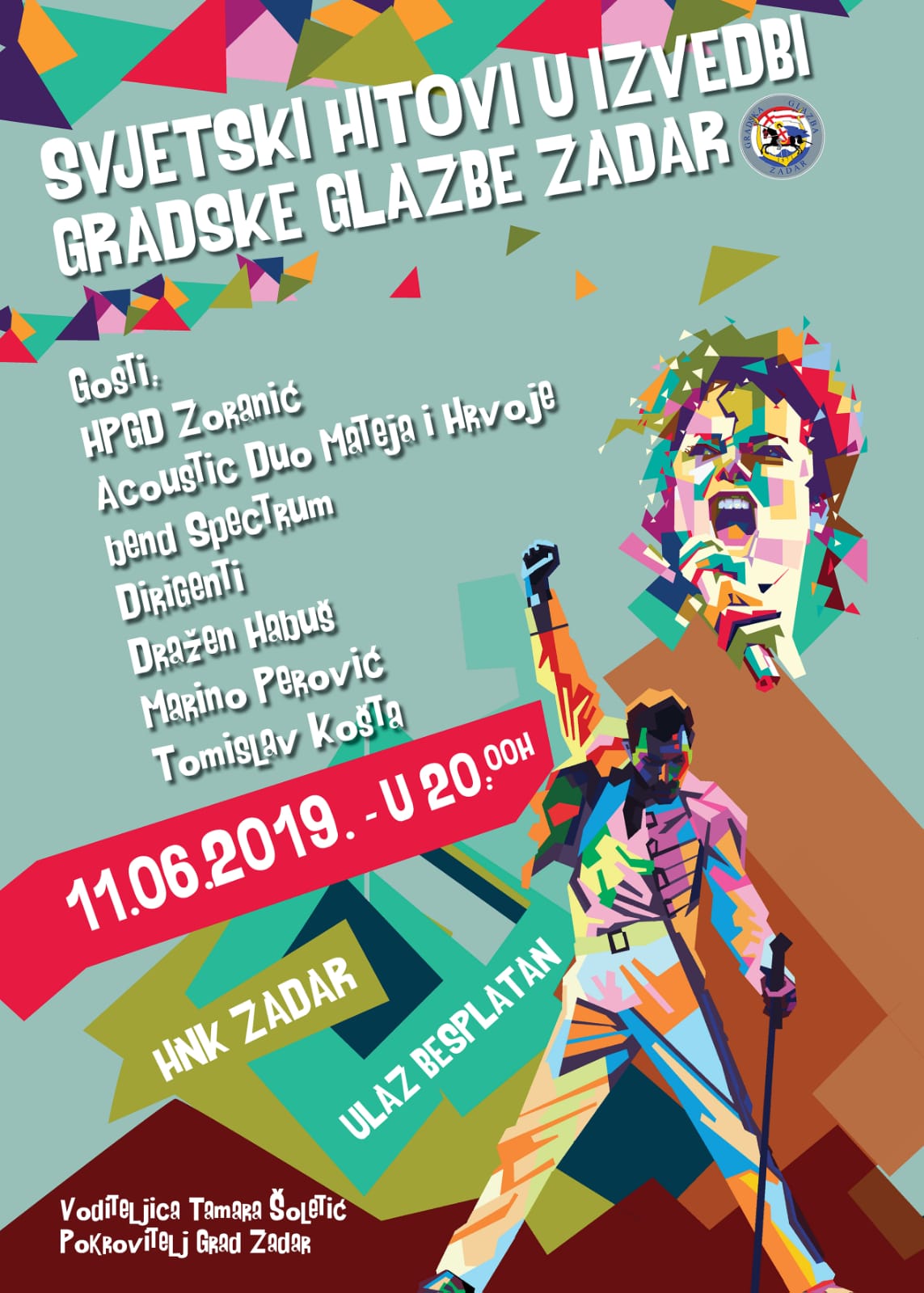 Gradska glazba Zadar najavljuje izniman glazbeni doživljaj. U utorak, 11. lipnja 2019. godine, u Hrvatskom narodnom kazalištu, s početkom u 20 sati, održat će cjelovečernji koncert pod nazivom „Svjetski hitovi u izvedbi Gradske glazbe Zadar“. Ovaj koncert prvi je u nizu ciklusa koncerata „Večeri uz Gradsku glazbu Zadar“, kojim publici želimo dočarati moderniji zvuk puhačkog orkestra.
