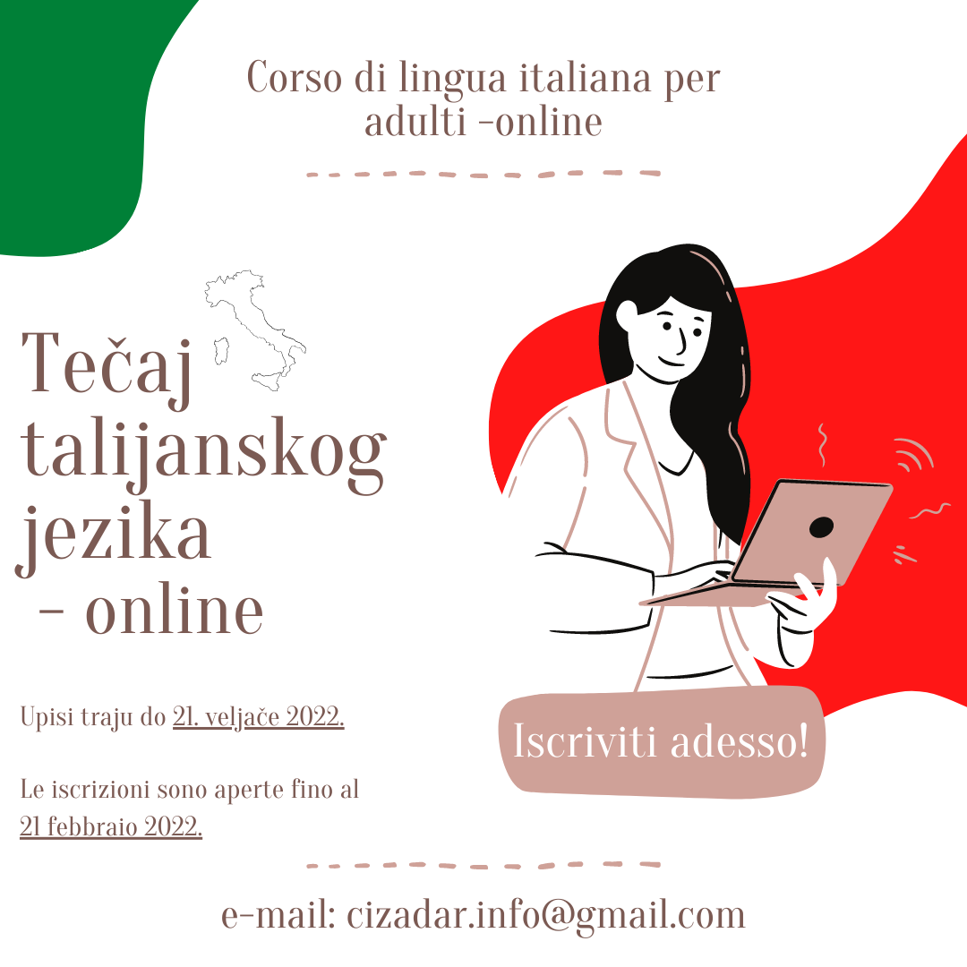 Tečaj talijanskog jezika za odrasle: Online tečaj talijanskog jezika Zajednice talijana u Zadru odvija se u malim grupama u realnom vremenu. Polaznici prate nastavu u virtualnoj učionici sa profesorima talijanskog jezika, a program je prilagođen uzrastu polaznika. Tečaj se provodi na interaktivan način, što podrazumijeva aktivno sudjelovanje polaznika i profesora na nastavi kao da se nalaze u stvarnoj učionici. Kako bi pohađali ovaj tečaj, polaznicima je potrebno osobno računalo, pristup internetu i e-mail adresa. Tečaj se odvija preko ZOOM platforme koja je jako jednostavna za korištenje. Jednim klikom na link koji se dobije putem e-maila, polaznici su odmah preusmjereni u svoju virtualnu učionicu. Svi potrebni materijali biti će dostupni u digitalnom obliku te ukoliko polaznik nije u mogućnosti biti prisutan na određenom satu, profesor mu može naknadno poslati odrađeno gradivo.