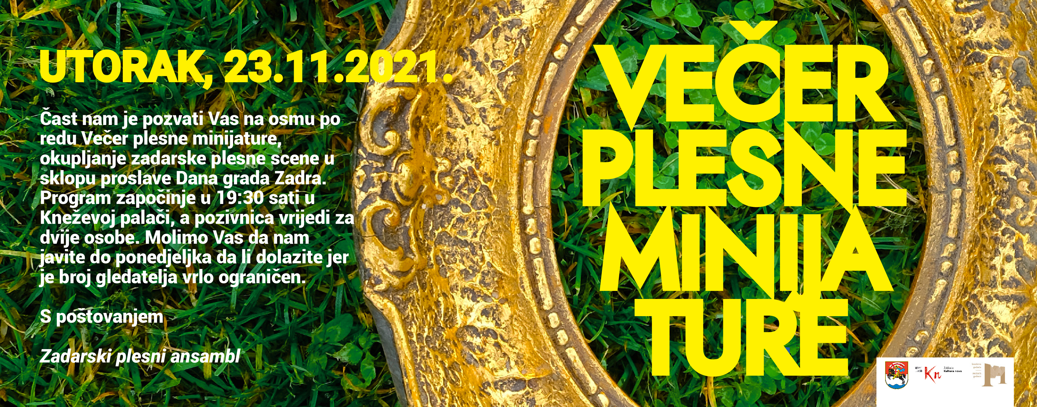 U sklopu Plesne sezone 2021. / 2022. Zadarski plesni ansambl u suradnji s Narodnim muzejem i Koncertnim uredom Zadar organizira osmu po redu VEČER PLESNE MINIJATURE koja se održava u utorak 23. studenog 2021. u 19:30 sati u Kneževoj palači.