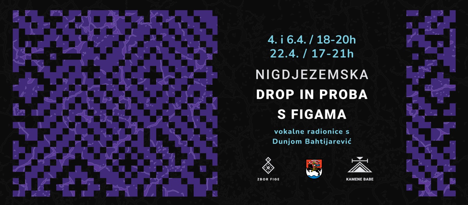 Drugi ciklus radionica u okviru zborsko-edukativnog programa Zbora Fige i Kamenih baba “Nematerijalna vokalna baština u suvremenom kontekstu” vodi Dunja Bahtijarević. Radionice će se održati u tri termina, 4. i 6.4. od 18 do 20 sati te 22.4. od 17 do 21 sat u prostorima Nigdjezemske (Ulica Stjepana Radića, iza Gradske knjižnice Zadar).