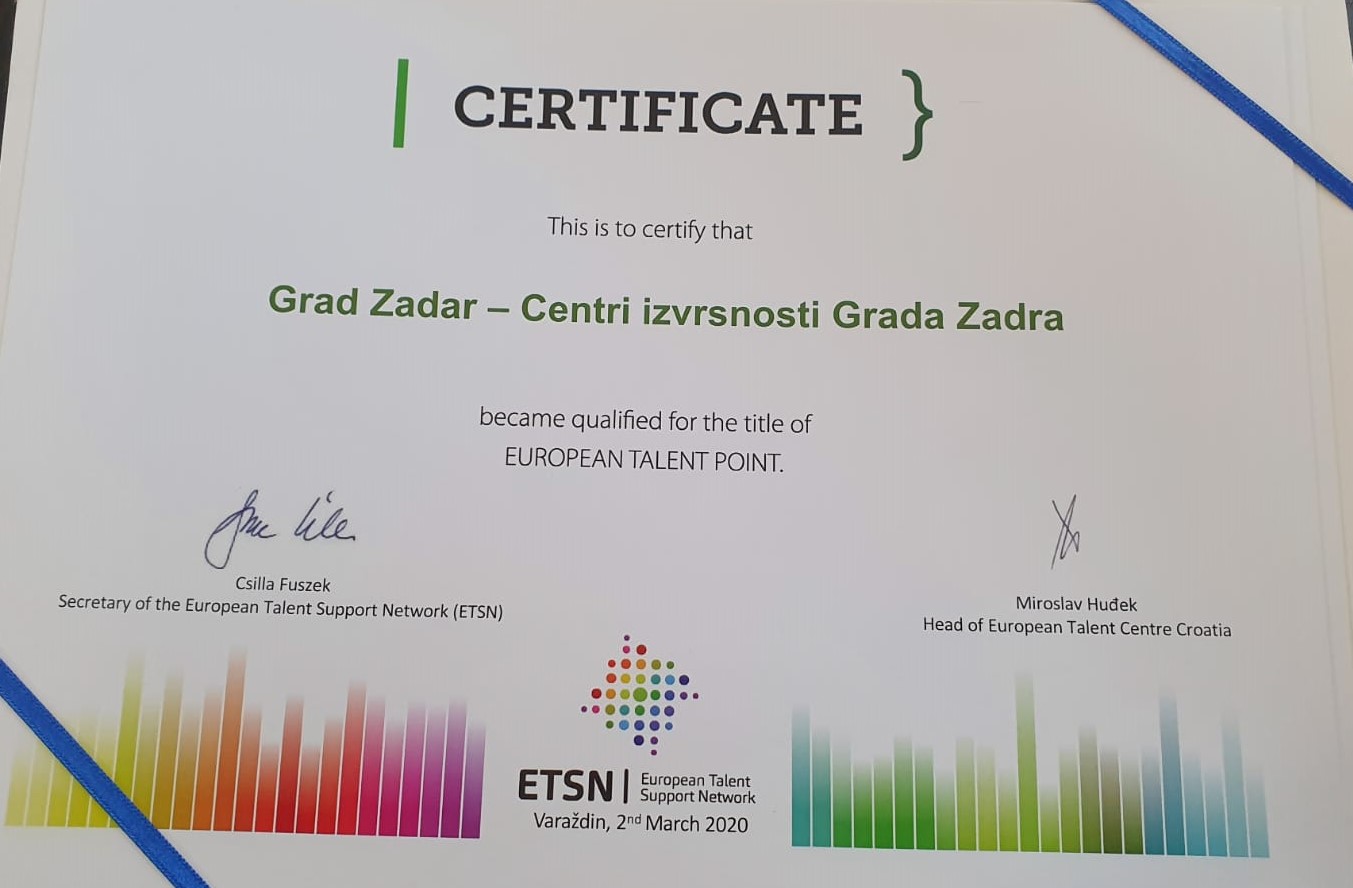Centrima izvrsnosti Grada Zadra 2. ožujka 2020. uručen je certifikat kojim postaje European Talent Point – Europska točka darovitosti. Svečanost je upriličena u Velikoj koncertnoj dvorani Glazbene škole u Varaždinu na 2. susretu registriranih European talent point-a u Hrvatskoj, u organizaciji ETC Hrvatska – Centri Varaždinske županije i Radboud University, Nijmehen Nizozemska.